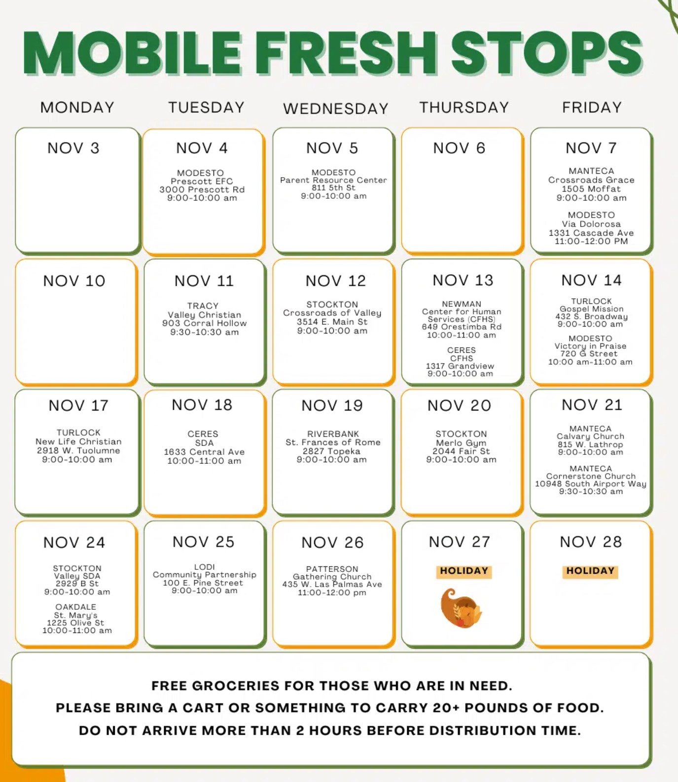 Food distributed on the second and fourth Tuesday of each month, from 9:00am – 11:00am in the Lathrop Senior Center Parking Lot.